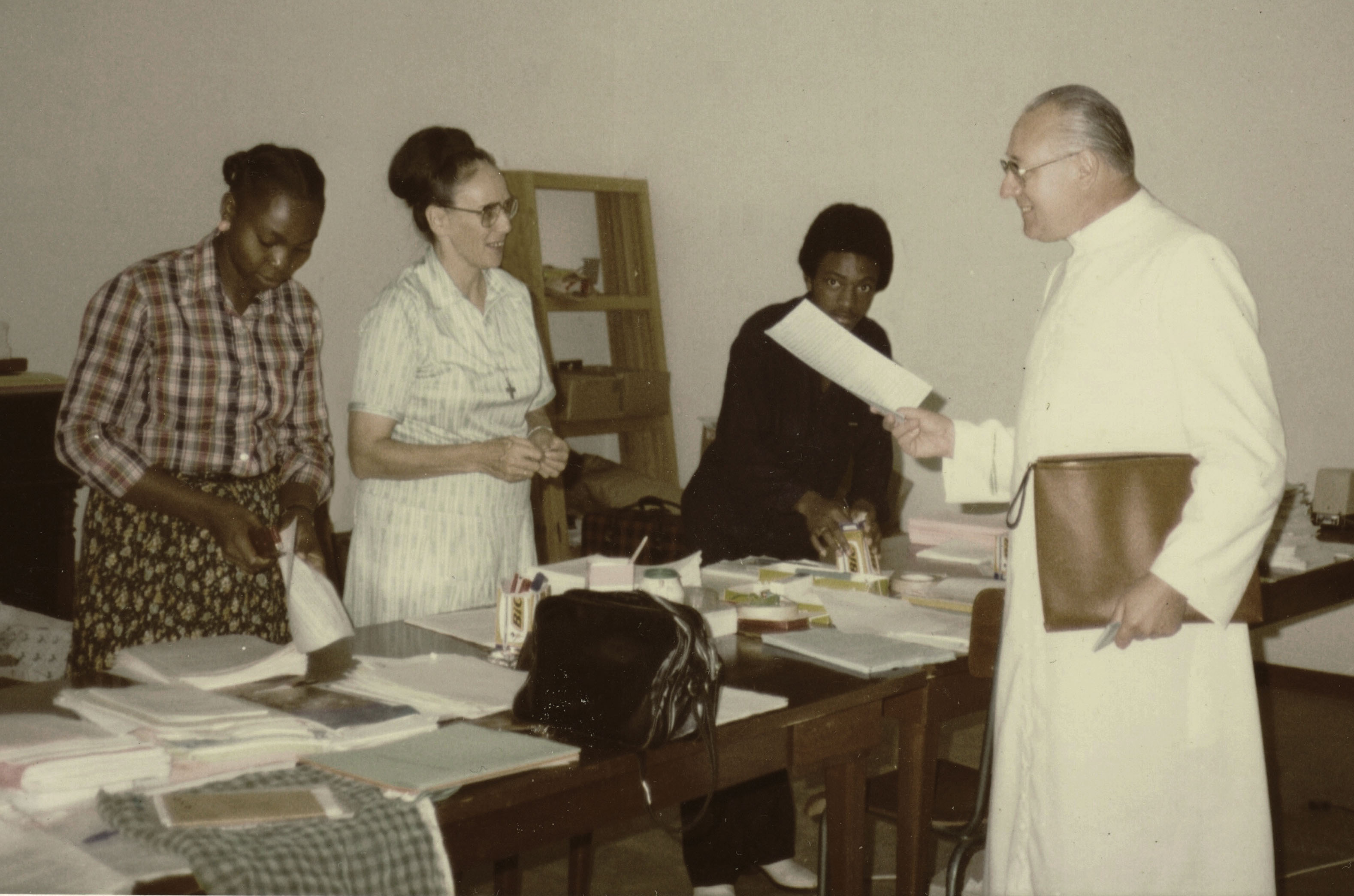 Monseigneur était capable de se mettre en route avec simplicité pour connaître la vie des gens. Je me rappelle qu’un jour, avant même de commencer ma collaboration en tant que Secrétaire, il était venu sans nous prévenir à la paroisse de Mva’a et il ne trouva personne, puisque nous les sœurs et les pères, nous étions dans les villages et donc, il vint nous chercher et il continua le tour avec nous pour mieux comprendre notre travail. Il nous appelait les équipes domino puisque nous étions européens et africains.